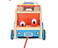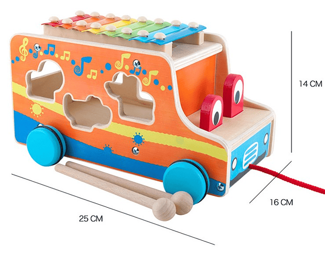 Entretenido Auto Safari con encaje y metalofóno. Ademas cuenta con cuerda para arrastrarlo y mueve los ojos. Producto 100% de madera.