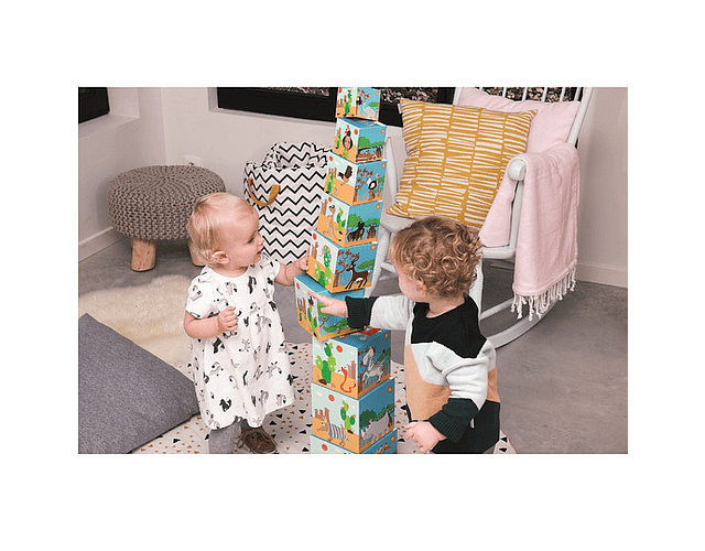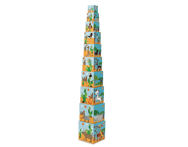 Torre de apilar, ideal para que los más pequeños desarrollen la motricidad fina y concentración, en sus caras tienen diferentes dibujos con motivos de animales, incluyendo asociación numero cantidad para poder practicar las matemáticas. 10 cubos de cartón apilables con diseño animales. Hecho en cartón altamente resistente.