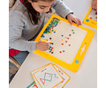 Ubica el lápiz magnético sobre la cubierta de plástico transparente, selecciona la ficha que quieras mover y deslízala para crear tus propios diseños o los patrones propuestos en las tarjetas.