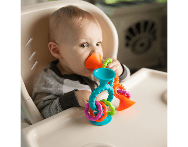 ¡Increíble juguete sensorial que con sus texturas y colores invitan a los niños para agarrar, jugar, sentir y chupar! Tienen ventosas para agarrarse de cualquier superficie lisa. Voltea y gira los anillos de plástico con textura para escucharlos sonar alegremente. ¡Seguro que se convertirán en el nuevo juguete favorito de tu bebé! Alienta la exploración sensorial, el aprendizaje causa-efecto y la experimentación temprana. La silicona suave es excepcionalmente buena para las encías doloridas. Hecho de 100% de silicona de alto grado, sin BPA, no tóxico, fáciles de limpiar y lavar.